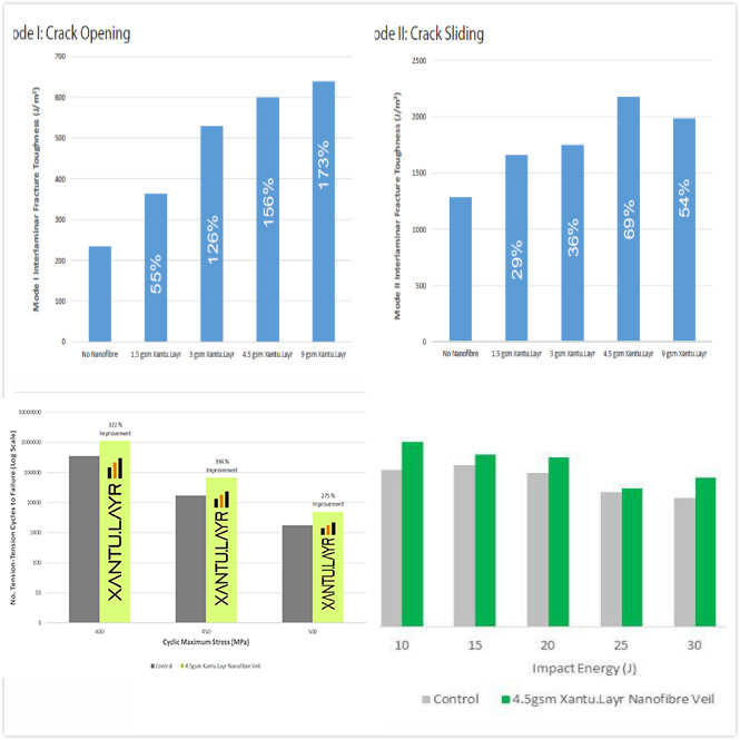 Xantu.Layr?納米纖維增韌膜采用靜電紡絲工藝,由幾千米長的熱塑性聚合物納米纖維組成,每根纖維比發(fā)絲細(xì)500倍左右。特別適合用于環(huán)氧樹脂基碳纖維預(yù)浸料的層間增韌,提高了復(fù)合材料的斷裂韌性(抗脫層性)、沖擊后抗壓強(qiáng)度(損傷容限)和抗疲勞性能,使樹脂在受到壓力或沖擊時(shí)不易發(fā)生微裂紋。