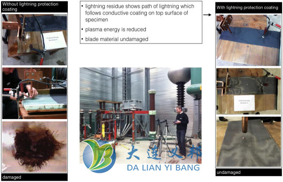 奧地利Villinger 經(jīng)過十幾年的努力成功研發(fā)出新型的雷擊防護(hù)產(chǎn)品,防雷擊涂料在很大程度上降低了維修成本,操作簡便與面漆涂覆工藝相近,干燥后重量約25g/㎡,不改變?nèi)~片氣動性能,無需取下葉片,完全適合高空作業(yè),是已建風(fēng)場改造方案的最佳選擇。