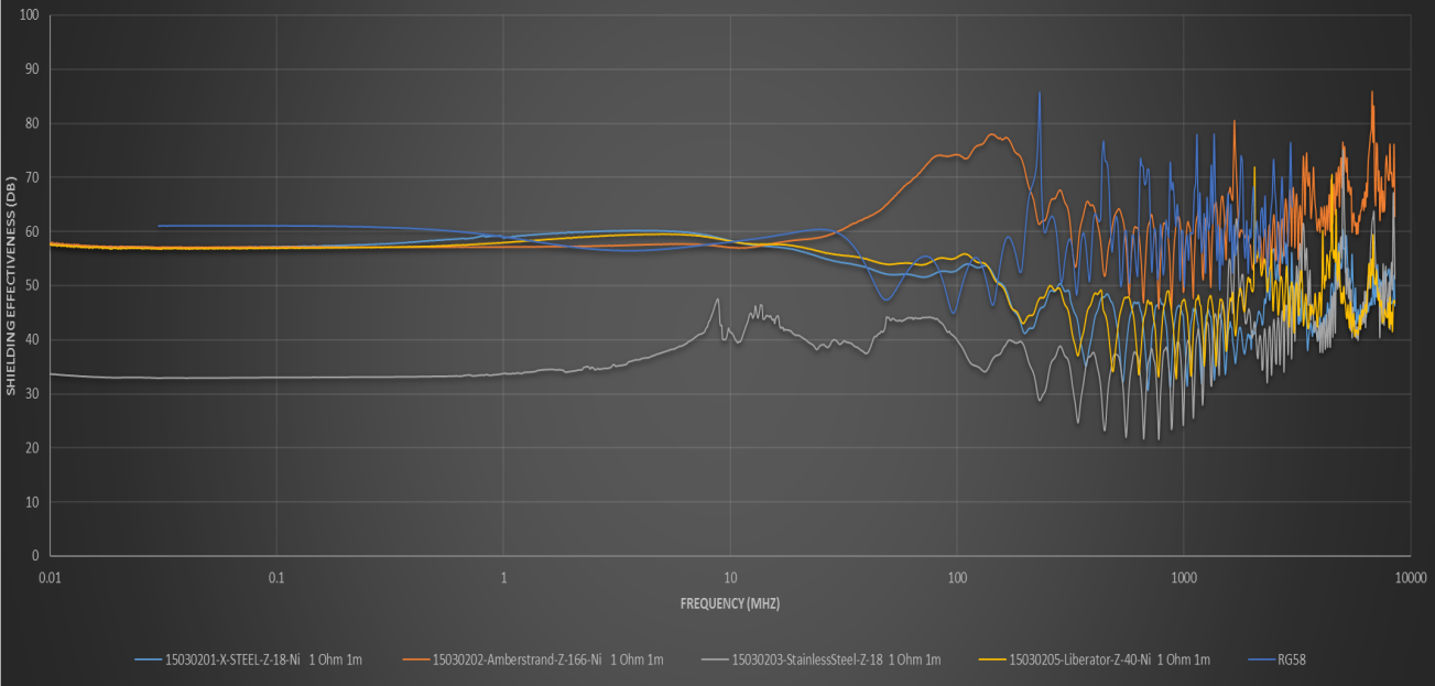 同時在德國公司用IEC62153-4-3測試標準和用同軸電纜RG58,去掉絕緣層和屏蔽層,用Lyofil或Liberator替換,然后和原電纜對比屏蔽效能得方法對下述防波套(Lyofil 166, Ni 64 和72股、Liberator 40, Ni 64和72股、Stainless Steel 18, Ni 72股、Stainless Steel 18, 72股)也進行屏蔽效能測試,測得除了傳統(tǒng)不銹鋼纖維絲,其他的幾種防波套都表現(xiàn)出卓越的屏蔽效能 (58-63 dB),如下圖