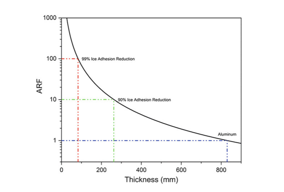 1、ARF越高,冰自行脫落效果越好,當(dāng)ARF達(dá)到100,冰的附著力降低了99%,冰累積的厚度也不會(huì)超過83mm, 因?yàn)檫_(dá)到這個(gè)厚度冰就會(huì)自行脫落。